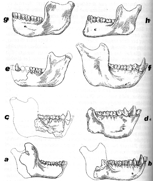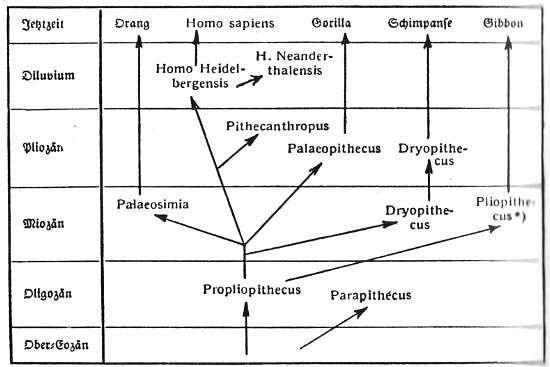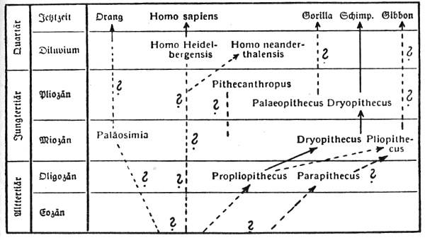 Die Gattungen dieses Stammbaumes treten auf weite Länder verteilt auf und sind zum Teil nur auf Kieferreste (Fig. 6) oder bloß Einzelzähne gegründet, von denen es teilweise überhaupt zweifelhaft ist, ob sie zusammengehören (Eoanthropus). Mit diesem Stammbaum erklärt Schlosser den Tertiärmenschen und seine vermeintlichen Primitivwerkzeuge (Eolithen) für widerlegt, zumal auch der diluvale Primitivkiefer des Homo Heidelbergensis die Hypothese eines Tertiärmenschen überflüssig gemacht haben soll. W. K. Gregory, der mit