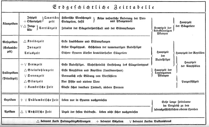 Die zwischen den einzelnen Erdperioden gezogenen Striche bedeuten keine scharfen Grenzen im zeitlichen Ablauf der erdgeschichtlichen Zustände und Vorgänge, als deren Produkt die Formationen, also die gleichalten Gesteinsserien der Erde mit ihren pflanzlichen oder tierischen Fossileinschlüssen, verdeckt oder offen aus früheren Zeitaltern daliegen. Auch sind die einzelnen Zeitabschnitte und Weltalter unter sich zeitlich nicht gleich lang, wie es nach den regelmäßigen Rubriken auf der Tafel scheinen möchte. Wenn man das Känozoikum = 1 setzt, so darf man nach der durchschnittlichen Gesteinsmächtigkeit seiner Ablagerungen das Mesozoikum = 3, das Paläozoikum = 12 nehmen. Eine absolute Zeitdauer, wonach der Nichtfachmann so gerne fragt, hat sich bisher noch nicht berechnen lassen. Doch mag man schätzungsweise für das Quartär rund 500 000 Jahre, für das ganze Känozoikum (mit Einschluß des Quartärs) 5-8 Millionen Jahre rechnen; demnach für das Mesozoikum 15-24 Millionen und für das Paläozoikum 60-100 Millionen. Möglicherweise sind dies Minimalwerte, doch zeigen sie, bis auf welches geringe Maß die vielfach verbreiteten größeren Ziffern zurückzuführen sind. Die vorpaläozoischen großen Zeitalter bis zurück, zur Urzeit der Erde mit der hypothetischen ersten Krustenbildung um den glühenden Erdball übertreffen jene drei genannten Weltalter um ein Vielfaches an Zeitdauer. Aus ihnen kennt man jedoch wenig Sicheres und vor alleim keine klar definierbaren, Tier- und Pflanzenreste wie aus den drei ersteren Weltaltern, die man deshalb auch als geologisch-historische Zeit den früheren Ären des Eozoikums und Azoikums gegenüberstellt. Zahllos sind die Lebewesen, die