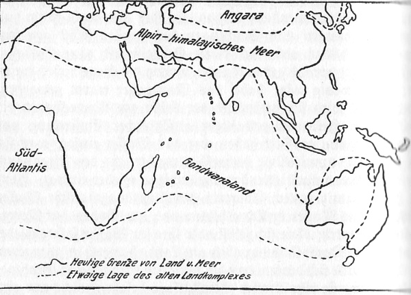 Schematische Skizze der Lage des Gondwanalandes zur Permzeit. Im Borden das asiatische Angoraland. Die heutigen Landgrenzen existieren noch nicht. (Original.) In dieser Hinsicht ist von der
