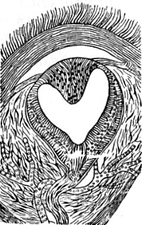 Von der anderen Seite angesehen, ist es jedoch nicht ausgeschlossen, daß von den ältesten fischartigen Urzuständen aus sich eine Entwicklungsbahn mit richtigem Stirnauge und andererseits die bekannten Saurier mit dem Parietal- oder Scheitelauge sich abzweigten. Der hypothetische Urmenschenstamm könnte zu dem ersterem Typus gehört haben, so daß man bei ihm von einem richtigen Stirnauge im strengsten Sinn reden müßte. Es ist in diesem Zusammenhang wichtig, daß die Frösche (Anuren) einen richtigen Stirnfleck haben, der in den Frontal- nicht Parietalknochen sitzt und damit auf jenen vermuteten uralten und richtigen Stirnaugenzustand hinweist. Dieses periphere Stirnorgan entspricht, wie Goette nachwies, aber auch der Zirbel, und das zeigt, daß ihr Hervortreten nach außen nicht an bestimmte Schädelknochen gebunden ist. Die Frage ist vorläufig nicht zu entscheiden, und ich gebrauche daher den Ausdruck Stirn- und Scheitelauge wechselweise noch in der unverbindlichen Form. (Vgl. hierzu: J. B. Rohon, Über Parietalorgane und Paraphysen. Sitzungsber. k. böhm. Ges. Wiss. [Math. Natw. Kl.]. Prag 1899, S. 1-15). 10) Eine Woche vor