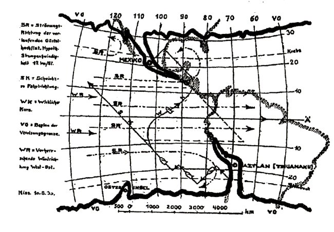 In bezug auf Aztlan findet man in allen sagenhaften Überlieferungen und in den ideografischen Notizen, wie sie die vielfachen Handschriften enthalten, die einheitliche und ausdrücklich unterstrichene Bemerkung von einem Ort, der von Wasser umgeben daliegt oder von dem man zu Wasser kommen muß; und von dort kamen auch die ersten Ankömmlinge, die Kulturträger, die als Boten der Zivilisation im alten Mexiko landeten. Es existieren Hunderte von Interpretationen jener Handschriften. Sie sind nicht nur ziemlich konfus, sie widersprechen sich auch. Die einen sind womöglich noch bizarrer und unzusammenhängender als die anderen. Aber in einem Punkte stimmen sie alle ausnahmslos überein, nämlich darin: Zwischen Mexiko und Aztlan gibt es Wasser. Die Bemerkung: "Zu Wasser von Aztlan nach Mexiko" eröffnet einen breiten Weg zur Entzifferung und Erklärung der wahren Grundlagen des Substrates 'Tihuanaku', in den prähistorischen mexiko-mittelamerikanischen Kulturen liegt es ganz klar und offen zutage. Kein Zweifel ist möglich. Die Aztlan-Sage repräsentiert eine uralte folkloristische Erinnerung an die ursprüngliche Heimat oder an den Ursprung des Kultus und der Kultur der Mexikaner. Nur die, die sich Augen und Ohren zuhalten und nicht sehen und hören wollen, können an Beziehungen zweifeln, die fraglos und offensichtlich zwischen der hohen klassischen interandinischen Kultur und der Kultur Mexiko-Mittelamerikas bestanden haben. Die, die das alles nicht sehen wollen, werden ebensowenig die 'Sarabatana' (Blasrohr, aus dem vergiftete Pfeile geschossen wurden) auf einer alten mexikanischen Zeichnung beachten, die Sarabatana, die aus den südamerikanischen Ländern stammt, dem eigentlichen Sitz, dem Stammland der arowakischen Rassen, die Sarabatana, die in Mexiko unbekannt ist. Noch weniger werden sie sehen wollen, daß die präkolumbianischen Edelleute der interandinischen Hochebene 'Orejones' (Männer mit Ohrschmuck im durchbohrten Ohrläppchen) waren, und daß auch die mexikanischen Götter und Fürsten als Orejones dargestellt sind; ebenso wie auf zahlreichen Zeichnungen auf Standbildern und in Handschriften menschenähnliche Figuren das typische 'Ojo alado' (geflügelte Auge) tragen und der Gott Yakatekuhtli der Mexikaner, abgesehen davon, daß er ein Orejon ist, die typischen vier Finger an den Händen und drei Zehen an den Füßen zeigt, genau wie der Sonnengott auf dem Monolithtore von Tihuanaku, und außerdem auf seinem Schild das echte 'signo eskalonado' (das Treppenzeichen) von Tihuanaku als Wappen führt. Der Tierkreis war, wenn auch nicht in derselben Form wie bei den Chaldäern, den Bewohnern von Tihuanaku bekannt, sie prägten ihn auf ihr ruhmvollstes Monument, die Puerta del Sol (das Sonnentor von Tihuanaku). Dasselbe Zeichen, nur mit geringen örtlichen Unterschieden und in barockisiertem Stil, verwendeten auch die Mexiko-Mittelamerikaner. Aber bei Ihnen ist noch mehr zu finden: nämlich ebenso wie in Tihuanaku die 'Tembeta' (kreisförmiges Schmuckstück für die Lippen) und das Halbmondmesser aus Bronze. Gehen wir nach Teotihuakan, dort wird das Barock von Tihuanaku noch deutlicher; das gleiche gilt für Mitla, Chichenitza, Palacio de las Monjas (Nonnenpalast), Casa colorado, Quiriga und sofort. Die Alabastervasen von Chichenitza sind wahre Dokumente des Tihuanaku-Barocks. In der neotoltekischen Ornamentik hat sich das geheiligte Symbol von Tihuanaku fast rein erhalten. Ganze Bücher müßte man schreiben, wollte man alles aufzählen, was dort an Belegen für das Substrat "Tihuanaku" vorhanden ist. Soll das alles Zufall sein? Oder, wie Bastian sagt: 'Völkergedanken'?....." Die Welteislehre