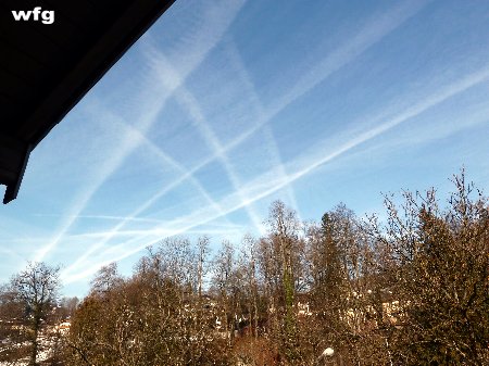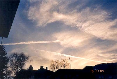 Ich hatte natürlich auf meiner Reise (Anfang März 2005) auf dem Balkan auch sehr oft den Himmel beobachtet, wegen eventuellen Sprühflugzeugen bzw. Chemtrails. In Slowenien und Kroatien habe ich keine Chemtrails gesehen, außer im Süden von Kroatien. Etwas nördlich von Dubrovnik ist mir eine sehr große Flugzeugdichte am Himmel aufgefallen. Zwischen Split und Dubrovnik wurde wirklich sehr intensiv gesprüht, und auch als ich in Bosnien war, sah ich auf kleinem Gebiet sehr viele Chemtrails! Was mir bei all diesen Flugzeugen aufgefallen ist, war folgendes: diese Flugzeuge, die eindeutig keine Zivilflugzeuge waren, sondern Militärmaschinen, kamen alle vom Staatsgebiet von Bosnien-Herzegowina aus geflogen, und meiner Meinung nach ist da die einzige logische Schlußfolgerung, daß es US-amerikanische Militärflugzeuge waren, die dort von amerikanischen Flugzeugbasen aus starteten. Während ich sonst auf dem Balkan bzw. in Südosteuropa nirgends diese Chemtrails gesehen habe, nicht in Bulgarien, Griechenland, Serbien, Slowenien, Kroatien (außer Süddalmatien). Ich habe außerdem beobachten können, als ich auf dem Weg nach Slowenien war (in Kärnten), daß dort in Kärnten sehr intensiv gesprüht wurde, sah dort auf einmal etwa 20 ( ! ) Chemtrails am Himmel, aber als die Sprühflugzeuge in Richtung Slowenien weiterflogen, machten sie seltsamerweise wenige Kilometer vor der slowenischen Grenze eine Schleife, um nicht slowenisches Staatsgebiet zu überfliegen, sondern drehten eben wieder um, um nicht Österreich zu verlassen. Ob da die slowenische Luftwaffe die immer ungekennzeichneten Flugzeuge wohl abgeschossen hätte, ging mir sofort durch den Kopf ... Seit zwei Tagen wird auch hier im Salzburger Land wieder intensiv gesprüht, es ist dabei immer das gleiche Bild, schon seit Monaten !! Die Flugzeuge kommen immer von Bayern über die Berge geflogen, in dieser Flugrichtung müßte eigentlich ungefähr München liegen, und es fliegen dann oft drei , vier oder fünf Flugzeuge eng nebeneinander mit ihrer Giftladung ... Auch heute (18.03.05) flogen sie wieder einmal den ganzen Tag kreuz und quer am Himmel ... ![]() Aufgenommen von Roland H. über
