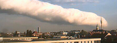 Dieses Bild wurde am 17. Juli 2009 morgens über München aufgenommen. Die Wolke (Eisbolide) hatte eine Geschwindigkeit von 60 km/h und schwebte/schoß in Richtung Nordosten. Betrachten wir den im Hagelunwetter sich kundgebenden Vorgang etwas genauer, so müssen wir zunächst im Auge behalten, daß die Atmosphäre ihrerseits wie ein elastischer Puffer wirkt und der Bolide durch Reibung seiner Oberfläche eine Abbremsung und Erwärmung erfährt. Nichtsdestoweniger wird aber seine vordere Außenhälfte vollkommen abgeschmolzen und verdampft, zumal Eis ein schlechter Wärmeleiter ist, sondern es werden Wärmeausdehnungs-Materialspannungen in seiner Außenkruste erzeugt, so daß diese sich zunächst losschält und körnig zerstiebt. Spannungsdifferenzen des Materials lassen die Schale in auseinandersprühende Teilchen zerbröckeln, die ihrerseits rasch und sich verlangsamend fallen, die langsam Wärme aufnehmen und sich reibend und anschmelzend zu rundlichen Eiskörpern, das heißt Hagel, gestaltet. Im Hinblick auf die hohe Einschußgeschwindigkeit geschieht die Eisabschälung am Boliden außerordentlich plötzlich, weitere Eisschichten schälen sich los, so daß sich der Körper mehr oder minder explosionsartig, mit noch verhältnismäßig hoher Einschußgeschwindigkeit begabt, in wenigen Sekunden zu einer Eiskörnerwolke auflöst. Diese Auslösung findet aus der ganzen Länge des Einschlagkanals in der Luft statt, und die milliardenfach zersplitterte Eismasse ist nichts anderes als eine Hagelwolke. Diese Wolke durchstößt nun in ihrer Gesamtheit die träge Luftmasse, die wie eine verzehntausendfachte Widerstandsfläche wirkt. Die kosmische Schußbewegung ist dadurch zwar aufgehoben, aber eine immerhin noch genügend starke lebendige Kraft der zahllos summierten Einzelkörperchen trotzt diesem Widerstand. Sie schiebt mit Sturmesgeschwindigkeit den Widerstand leistenden Luftbereich vor sich her, sendet sozusagen eine (zufolge der Luftelastizität sich bildende) Kompressionswelle voraus. Hierbei werden naturgemäß infolge Luftreibung auch beträchtliche, ständig sich vergrößernde Nachbarluftmassen schräg nach abwärts oder auch mehr oder weniger tangential mit in die Tiefe gerissen. So wird uns der dem Hagelschlag unmittelbar vorauseilende Sturm verständlich, der auf den von der Hagelwolke vorausgeschobenen Luftmassen beruht. Der vorausgeschobene