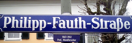 In Grünwald bei München wird bis heute an Fauth gedacht, der hier einst eine Sternwarte betrieb. H.W. Behm/Ph. Fauth (Quellenschriftauszug aus dem Buch: "Hörbiger - ein Schicksal" von H.W. Behm, 1930, v.Hase & Koehler Verlag, Leipzig und aus dem Buch "Mondesschicksal - wie er ward und untergeht" von Ph. Fauth, 1925, R. Voigtländer Verlag, Leipzig) |