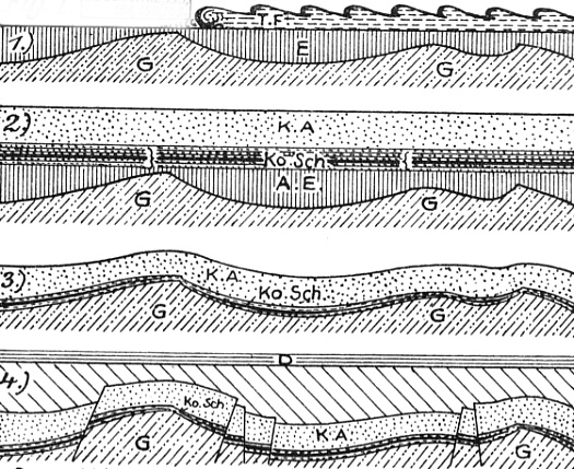 in Böhmen angesehen werden könnte. Die Buchstaben bedeuten: 1.) T.F. = Tagesflut. E = Landeis. G = Altes Silur-Grundgebirge. 2.) K.A. = Kohlen-Arkose = feldspatreicher Sandstein. Ko.Sch. = Kohlenschichten. A.E. = später ausschmelzendes Eis. G = Grundgebirge. 3.) K.A. = Kohlen-Arkose. Ko.Sch. = Kohlenschichten. G = Grundgebirge. 4.) D = Diluvium. T.A. = Tertiäre Ablagerungen. K.A. = Kohlen-Arkose. Ko.Sch. = Kohlenschichten. G = Grundgebirge. Der Nadirflutberg des Sekundärmondes lagerte auf einer des Urgebirge bestehenden Eisschicht Kohlenbaumaterial ab, das später von dem durch den herangekommenen Zenitflutberg mitgeführten Gesteinsmaterial (Kohlen-Arkose) bedeckt wurde. Nach dem Ausschmelzen des Eises legte sich die Kohlenschicht auf das Gebirge. Spätere Zeiten bedeckten alles mit Tertiärablagerungen. Die Wogen brandeten aber nicht