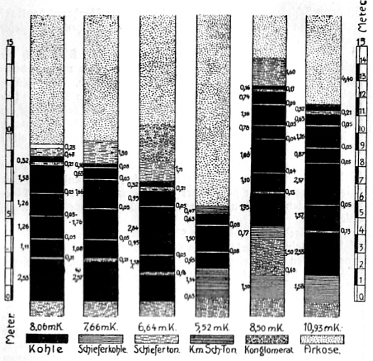 einmal eine nur 0,6 m starke Kohle, auf die sich wieder eine Lagenreihe