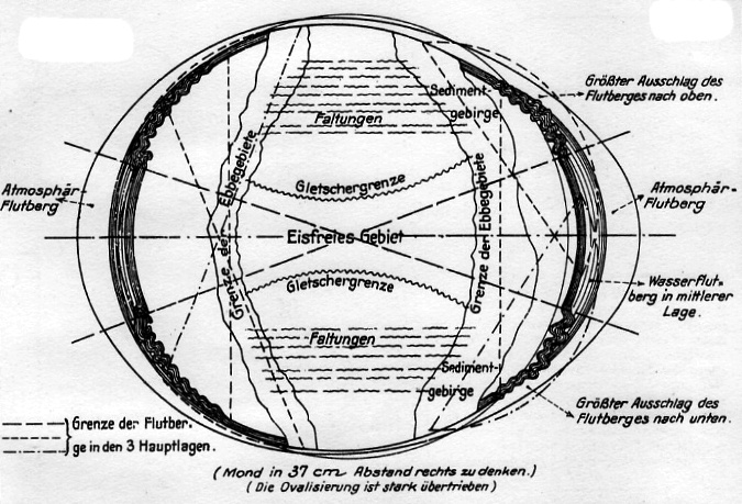 Man kann die Frage stellen, ob es möglich sein dürfte, den Flutbergen die Fähigkeit zuzubilligen, Sedimentlagen in 5000 m und mehr Höhe aufschichten zu können, und ein Zweifel hieran könnte berechtigt erscheinen, solange man sich nicht von der Vorstellung frei machen kann, daß in jenen Zeiten Meer und Land ähnlich wie heute dagelegen hätten. Bedenkt man aber die so ganz andere Verteilung von Wasser und Land und zieht dabei in Betracht, daß die Höhe der Sedimentschichten nicht die Arbeit eines einzelnen Flutbergsvorüberganges ist, sondern daß bis jetzt sicher 4 Monde daran tätig gewesen sind, so erscheint die Sache schon weniger problematisch. Hierzu kommt, daß jede Gebirgsbauperiode sich aus zwei Abschnitten zusammensetzt und daß über die Gebiete, die ein Nadirflutberg bis zur Grenze seiner Leistungsfähigkeit mit Sedimenten bedeckt hat, der Zenitberg ebenfalls noch einmal in Tätigkeit tritt und infolge seiner größeren Höhe eine zusätzliche Aufbauarbeit auf die bereits daliegenden Schichten leisten kann; mit der größeren Höhe wächst aber auch die Stoßkraft des in Bewegung befindlichen Wassers, sich über weite Flächen hinwälzen oder im Wege stehende Widerstände überschreiten zu können, was nicht übersehen werden darf. Wer imstande ist, diese Vorgänge plastisch nachfühlen zu können, wird kaum im Zweifel befangen bleiben können, ob die Flutberge eine solche Arbeit zu leisten imstande sein werden, im Gegenteil, diese Vorstellung wird sicher leichter zu gewinnen sein, als die, daß derartige Schichten Flußablagerungen (und stammten sie von viel ungeheureren Strömen wie wir sie heute kennen) sein können. Die Last der aufgelagerten