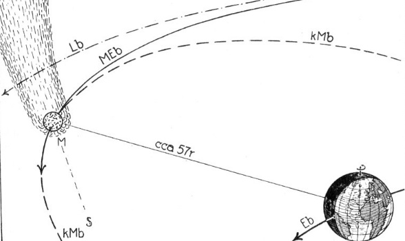 Der siedende Mond. Die Bildung eines kometenartigen Schweifes beim Mondeinfang. Die ihn erzeugenden winzigen Eiskristalle werden von dem Lichtdruck der Sonnenstrahlenn in den Weltraum gedrückt und zeigen wie jeder Kometenschweif sonnenabgewendete Richtung. Der Atlantisrücken wird hier eben durch die Einfangsflut unter Wasser gesetzt. Zugunsten der Anschaulichkeit ist im obigen Bilde entgegen der Schilderung Atlantis während der Überflutung noch auf der Tagseite der Erde gezeichnet. Eb = Erdbahn; Lb = Lunabahn; diesen Weg hätte der Planet Luna verfolgt, wenn er nicht, von den Schwerekräften der Erde ergriffen, in seine neue Bahn: MEb = Mond-Einfangbahn gezwungen worden wäre. kMb = künftige (heutige) Mondbahn; M = Mond; S = Richtung, in der die Sonne steht, deren Strahlungsdruck den Eisdampf des Mondes in kometenschweifartiger Form in Richtung SM in den Weltraum drängt. (Zeichnung nach Hörbiger.) Die Endkatastrophe muß