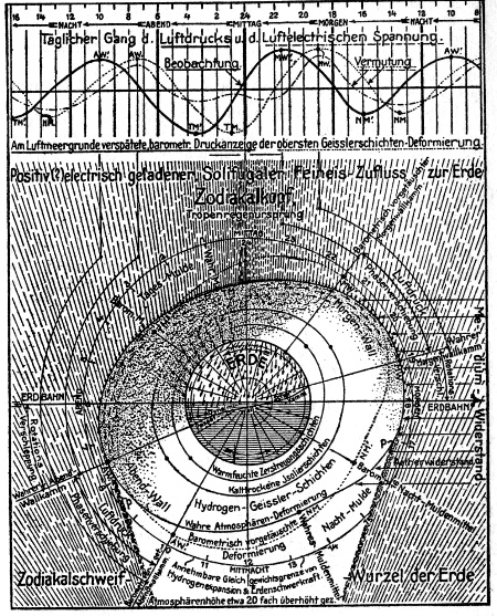 Vergegenwärtigen wir uns nun aber all das, was wir bei der Besprechung der Kreuzwege (1) erfuhren, so sind wir genötigt, vorerst die elektrische Ladung der Feineis-Kristalle (Feineis ist positiv, Erde ist negativ) zu berücksichtigen und zu wiederholen, daß während einer Feineis-Anwirkung sich ein Spannungsausgleich zwischen höchsten Luftschichten und Erdoberfläche vollzieht. Gleichzeitig steigt hiermit die unsichtbare oder doch nur sehr wenigen Personen sichtbare Erdstrahlung an, die ihrerseits wieder derart auf die Nerven der Lebewesen wirkt, daß eine Verengung der feinsten Blutgefäße und eine allgemeine nervöse Erregung oder doch Erregbarkeit die Folge ist. Jede nervöse Erregung oder Erregbarkeit ist aber mit einer Verminderung der inneren, der Gemütsruhe und damit auch mit einer Beeinträchtigung der Aufmerksamkeit, der inneren Sammlung verbunden, so daß wir, ohne Goethes Beobachtung auch nur zu kennen, einfach ein Nachlassen der Arbeitsfreudigkeit während einer kosmischen Anwirkung erwarten müssen, die ihrerseits rein äußerlich von tiefem Luftdruck begleitet ist. Wir würden sogar noch wesentlich feinere Forderungen aufstellen können: Schon ehe das Barometer sich überhaupt rührt, würden wir sagen können, dürfte bereits im Augenblick des Zusammentreffens zwischen Feineisstrahl und irdischer Gashülle durch den sofort einsetzenden Ausgleich der kosmischen und irdischen elektrischen Spannungen, die nervöse Erregung des Lebens bemerkbar sein müssen, während erst viel später der Ausgleich im Luftmeer selbst zum Ausdruck kommt, das Barometer also "fallen" läßt. ![]() (Bild- u.. Textquelle: Buch "Der Weg ins