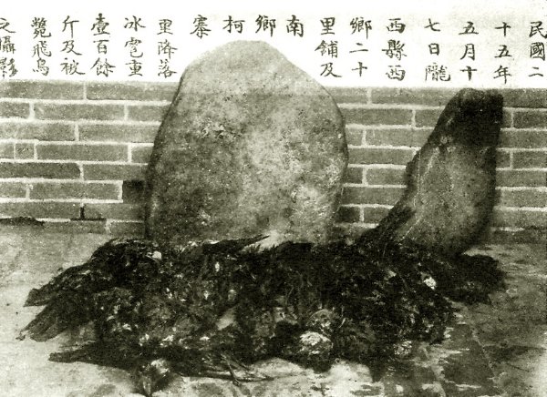 Der große Eisblock in der Mitte wog 120 Pfund. Im Vordergrund erschlagene Tauben und Krähen. Der chinesische Text lautet: "Am 17. Mai 1937, 25. Jahr der Republik China, im Zwanzig-Li-Dorf (ein 10 km langes Dorf) der "westlichen Gemeinde" sowie in der "südlichen Gemeinde" des Kreises Longxi (westlich des Long-Gebirges) sind Hagel gefallen, die über 100-Jin (1 Jin = zirka ½ Kilogramm, also mehr als 50 Kilogramm) wiegen und mehrere Vögel getroffen haben. Hier deren Bildaufnahme." (übersetzt: Dr. Han Yi) Der Missionar P. Paul Müller, Lung-si (südlich von Kan-su, China) berichtete über das schreckliche Hagelunwetter, während welchem der oben- genannte Riesen-Eisblock niederfiel, in der naturwissenschaftlichen Zeitschrift "Natur und Kultur", 33. Jahrgang, Heft 8, in welcher auch das beigegebene Bild enthalten ist. In diesem Berichte heißt es unter anderem: "... Es ist ein schwüler Tag. Spannung liegt in der Luft, Windstille. Um vier Uhr nachmittags sammeln sich plötzlich gewaltige Wolkenmassen an, rauhe Windstöße folgen. Wetterleuchten durchblitzt schon die geschwärzten Wolken. Mit einem Male ein Brausen, Blitzen, Krachen, ein Tosen und Donnern, wie in einer wahrhaften Hölle. Die ersten Hagelkörner fallen und reißen die Blätter und Früchte von den Bäumen. Dann brandet ein furchtbares Donnerwetter über Lung-si. Nur wenige Regentropfen fallen, es kommt zu keinem vollen Erguß. Plötzlich braust ein Nordsturm heran und sogleich ist eine jähe Kälte spürbar. Die Hagelkörner werden immer größer und größer, sie gleichen bereits Taubeneiern - und nun kommt das Niegesehene, Nieerlebte, vom Himmel herniedergesaust kommen richtige Eisbrocken, auch solche von 10, 20 und 30 Pfund Schwere, und schließlich kracht ein Riesen-Eisblock von 120 Pfund Gewicht zur Erde. Die maigrünen Saaten sind vernichtet, Bäume entwurzelt, in den Grund geschlagen. Tausende von Krähen, Elstern und Tauben liegen tot auf den Feldern. Hunderte von weidenden Schafen, Bergziegen und selbst Rinder sind erschlagen. Hirten ließen mit ihrer Herde das Leben. Kinder, die im Freien spielten, konnten sich nicht mehr retten und wurden erschlagen. Das Unwetter hat sich erst nach einer Stunde ausgetobt. Nun wälzen sich die hoch angeschwollenen Gebirgsbäche wildtosend heran und begraben die Häuser links und rechts unter ihren Fluten...." (1) Dieser Bericht galt damals als