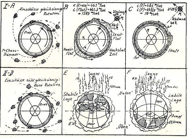 Die Mond sind es somit, die nicht nur gelegentlich deren Auflösung durch ihre der Erde einverleibten bewegten Massen dieser einen Drehungsantrieb zuteil werden lassen, sondern auch mittels des irdischen Wassers die Rotation begünstigen, derart, daß die dem schließlich drei- bis viermal täglich um die Erde rasenden Mond folgende Meeresflut der unter ihr langsamer sich drehenden massigen Gesteinserdenkugel einen verhältnismäßig leisen, aber steten Beschleunigungsschub vermittelt. Dieser Vorgang wiegt die in der vorstationären Zeit erfolgte Bremswirkung der nacheilenden, durch den noch langsameren Mond bewirkten Wasserfluten nicht nur auf, sondern übersteigt sie wesentlich, so daß nach jeder abgeschlossenen Mondzeit auch eine Erhöhung der Erdrotation zu folgern ist. (Abb. I A-C.) ![]() (Bildquelle- u. text: s. Quellenangabe