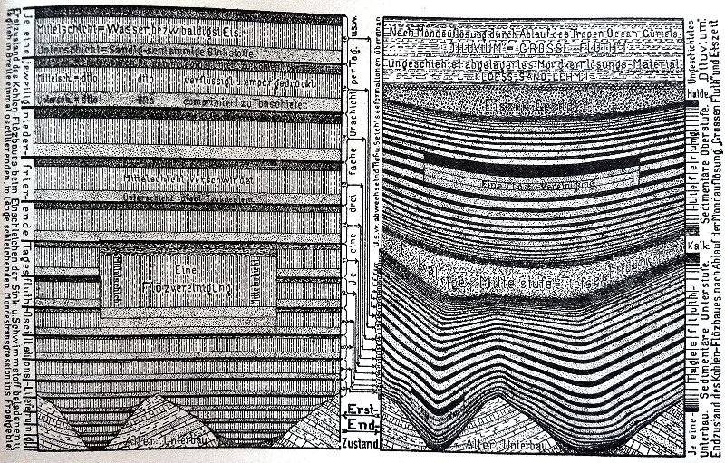 Nach Hanns Hörbiger jedoch werden die Schichten nicht am Grunde des Meeres abgelagert und von dort samt dem Grunde heraufgehoben, sondern das Meer pendelt, der Bewegung des Mondes folgend, über die Kontinente, wobei an den Randgebieten der Fluten Sedimentschichten gebildet werden, die während der Ebbezeit zusammengefrieren. Während des eintägigen Monats, als die beiden Flutberge beinahe feststanden (Bemerk. WEL-Institut: über dem afrikanischen Kontinent) und nur 5 Grad über und unter den Äquator auf- und abpendelten, war nicht nur das Wasser, sondern auch das Luftmeer zusammengezogen worden, und zwar über den Flutbergen in eiförmiger Gestalt. Die Weltraumkälte drang zwischen den Wasserbergen immer mehr gegen den Äquator in die unter geringem Luftdruck liegenden Breiten vor, und die Vereisung der Erde war, mit Ausnahme der unter höherem Luftdruck liegenden Flutberggebiete, vollständig geworden. In den mittleren und höheren Erdbreiten, über welche die Ebbe-Ausläufer der pendelnden Flutberge noch hinüberrauschten, herrschte also eine unausdenkbare Kälte. Die von den Flutbergen bis fast zu den Polargegenden geschleuderten Wassermassen konnten daher zum Teil nicht wieder zurückfluten, sondern blieben glattgefroren auf dem Ebbegebiet liegen. Dabei führten diese Ebbeausläufer nicht etwa klares Ozeanwasser mit sich, sondern eine Schlammbrühe, gemischt mit Geröll und Sanden, mit Tierleichen und Pflanzen, mit Schnecken und Muscheln, alles zu einem Gemenge von tropischen Trümmermaterial durcheinander gerührt. Überstürzte nun ein Flutberg beim Aufwärtspendeln ein überfrorenes Ebbegebiet, so sanken zuerst die schweren Gerölle zu Boden, dann der Reihe nach die kleineren und leichteren Stoffe, und zum Schluß, an der Spitze des Ebbeausläufers, kam dann erst der Pflanzenhäcksel als bestschwimmendes Material. Dieser ersten groben horizontalen Sortierung folgte sogleich eine zweite und gründlichere vertikale Sortierung nach Größe und spezifischem Gewicht, also nach Sink- und Schwimmstoffe, wenn ein Flutberg umwendete und den Rest seiner Ladung auf den vereisten Gebieten zurückließ. Gleichzeitig begann sich bei der herrschenden ungeheuerlichen Kälte über dem vom Flutberg zurückgelassenen Wasserrest eine beinharte Eisdecke zu bilden: In kurzer Zeit war die ganze Wassermenge bis auf den Grund zu Eis erstarrt, einschließlich der sauber sortierten Sinkstoffe, der Schlamme, Sande und Quarzkörper. So legte sich Tag für Tag und Jahr für Jahr eine dreifach geordnete Schicht hartgefroren über die andere, und diese Schichten türmten sich schließlich, samt ihrem eingefrorenen Inhalt, zu ganzen Schichtengebirgen auf (Bemerk. WEL-Institut: diese Gebirgsbildung dauerte Tausende, wenn nicht sogar Zehntausende von Jahren). ....... Während sich die von den
