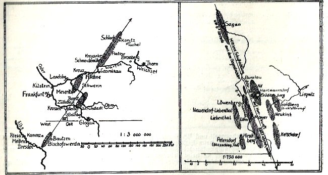 Rechts: Hagelfall vom 26. April 1930. Trefferbild wie bei einem Schrapnell in großer Sprenghöhe und merklichem Fallwinkel, zeigt an, daß die Hagelfälle nicht aus einem fortschreitenden atmosphärischen Wirbel stammen. Zerteilung des Eiskörpers von vornherein in mehrere große Stücke. Tiefenstreuung 115 km, Gesamtbreite 35 km, einzelne Striche aber schmal. Gewaltige Wassermassen. Bei Gr. Hartmanssdorf dicke, tagelang liegengebliebene Eismassen. Der Eiskörper ist nicht