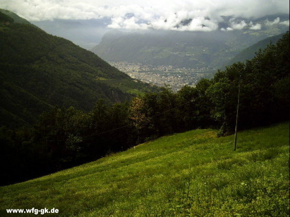 Auch diese Reise führte uns - auf dem Weg des Geheimnisses "Alle 700 Jahre" - diesmal in das Reich des Zwergenkönigs Laurin, in den Rosengarten von Südtirol. Viel hatten wir bereits über den sagenumwobenen Rosengarten gelesen und recherchiert. Die Geschichten über den Zwergenkönig Laurin wurden Mitte des 13. Jahrhunderts von den deutscchen Minnesängern Wolfram von Eschenbach und Walther von der Vogelweide in poetische Verse gekleidet. Hierbei wurde eine urdeutsche Sage verarbeitet, die sich auf Geschehnisse bezieht, die wiederum zirka 700 Jahre zuvor stattgefunden haben. Es ist wieder die Spur, die wir auf unserer Italienreise verfolgt haben: 1250 und (die 700 Jahre zurück) bis zum Jahre 550 n. Chr. Um welche Geschichte geht es, die die deutschen Minnesänger bewogen hat, sich mit Heldensagen zu beschäftigen, die bereits 700 Jahre zurücklagen? Es ging wieder um den Gotenkönig Theoderich, diesesmal wurde er jedoch mit dem Namen "Dietrich von Bern" benannt. Bern war damals jedoch nicht eine Stadt in der Schweiz, sondern das heutige Verona. Damals bezog sich der Städtename auf ein kostbares Handelsgut, nämlich Bernstein, das von der Ostseeküste herangeschafft wurde. Bernstein war auch als "Elektron" bekannt. Bei der Geschichte von Dietrich von Bern handelt es sich in kurzer Erläuterung um folgende Sage: Ein Gefolgsmann von Dietrich bat diesen um Hilfe, da seine Schwester von dem Zwergenkönig Laurin entführt worden war. König Laurin entführte das Mädchen in seinen wunderschönen Rosengarten, der sich auf einem hohen Berg befand. Der Sage nach lag dieser "Rosengarten" auf dem heutigen Rosengartengebirge in Südtirol bei Bozen. Nach langen Kämpfen gelang es, den König Laurin zu besiegen und das entführte Mädchen zu befreien. In der Gefangenschaft sprach König Laurin einen Fluch aus, daß niemand fürderhin seinen herrlichen Rosengarten sehen sollte, "weder bei Tag, noch bei Nacht". Aber er hatte vergessen die Dämmerung mitzuerwähnen, und so bietet sich dem Betrachter bis auf den heutigen Tag die Möglichkeit, doch noch einen Eindruck von der einstigen Schönheit des Rosengartens zu erhaschen. Nämlich immer, wenn die atmosphärischen Bedingungen günstig sind, erstrahlt auch heute noch in der Abenddämmerung der Gipfel des Rosengartens in einem feurigen Rot. Diese Geschichte des Rosengartens, die der interessierte Leser gerne einmal selbst nachlesen sollte, war der Anlass für uns, Ende Juli 2006 nach Südtirol zu fahren. Denn 700 Jahre nach den deutschen Minnesängern fand die Geschichte von Dietrich von Bern die Aufmerksamkeit von Otto Rahn, einem Forscher und Schriftsteller, der während der Zeit des Dritten Reiches im Auftrage des "Ahnenerbes" tätig war, er ahnte hinter dieser vordergründigen Entführungsgeschichte ein mystisches Geheimnis um die Minne. Minne ist Gedenken an unserer Herkunft. Auf unserer Hinfahrt befuhren wir ein Teilstück der uralten Bernsteinstraße, die einst von Venedig ins Etschtal, zum Brenner, über Rosenjoch ins Inntal, an Rosenheim vorbei nach Passau und immer weiter bis zur friesischen Küste und zu den Gestaden des Eridanos: der Elbe oder der Eider, führte. Uralte Ortnamen wie Gossensaß (Gotensitz) errinnern an die einstigen Bewohner von Südtirol. Wir sahen ein dabei wenig skeptisch zum Himmel, denn dunkle Wolken und Regen liessen uns zweifeln, ob wir diesesmal den Rosengarten in ganzer Schönheit sehen könnten oder, wie im Jahr zuvor, nach einem vergeblichen Versuch wieder unverrichterter Dinge zurückfahren müßten. Parallel zum Eggental kurvten wir mit dem Auto einen Berg hinan, der uns immer höher und höher führte, bis wir glaubten fast im Himmel angekommen zu sein. Aber selbst hier oben stehen Häuser und Gehöfte - auf über 1000 Metern Höhe! ![]() Blick