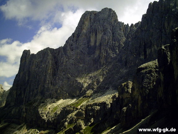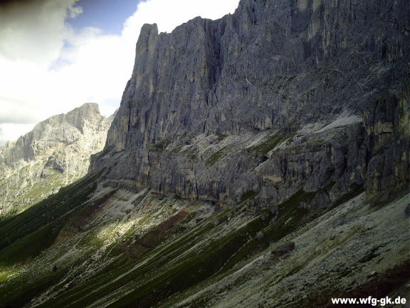 Nach zirka 20 Minuten befanden wir uns am Fuße des Rosengartenmassivs, also bis zu der Stelle, bis wohin einst Dietrich von Bern mit seinen Gefolgsmannen hingelangt sein mußte. ![]() Hier