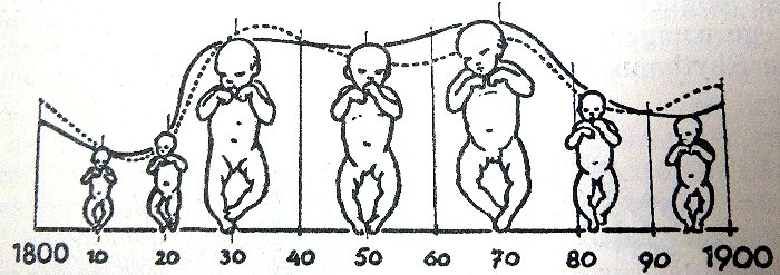 Die eingezeichneten Figuren, deren Haltung und Höhe nach dem jeweiligen Stand der geistigen Spannkraft gewählt wurden, zeigen uns bereits bei flüchtigem Blick, wie disharmonisch unsere Tageseinteilung ist. Die heute vorwiegend nachgeahmte englische Arbeitszeit von 9 Uhr morgens bis 5 Uhr nachmittags ist vollendete Disharmonie! Schon gegen 11 Uhr mittags (Tagesmulde (4)) beginnt die Spannkraft meist sehr deutlich abzusinken, um erst gegen 3 Uhr nachmittags wieder anzusteigen. Die frühere Arbeitszeit von 8-12 (7-1) und von 3-7 Uhr entspricht viel besser den natürlichen Notwendigkeiten, sie dürfte infolge ihrer harmonischen Gestaltung auch ein durchschnittlich besseres Arbeitsergebnis gezeitigt haben als die (an sich bequemere) englische Arbeitszeit. Ein dickes Buch wäre